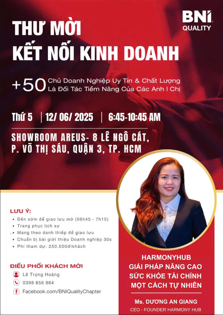 Diễn giả tuần này của BNI Quality là một nhà lãnh đạo, truyền cảm hứng. Hãy cùng BNI Quality khám phá về chủ đề "Harmonyhub: Giải Pháp Nâng Cao Sức Khỏe Tài Chính Một Cách Tự Nhiên" – một workshop độc đáo sẽ diễn ra vào lúc 6:45 - 10:45 sáng Thứ 5, ngày 12 tháng 6 năm 2025, tại Showroom Areus, số 8 Lê Ngô Cát, Phường Võ Thị Sáu, Quận 3, TP. Hồ Chí Minh.