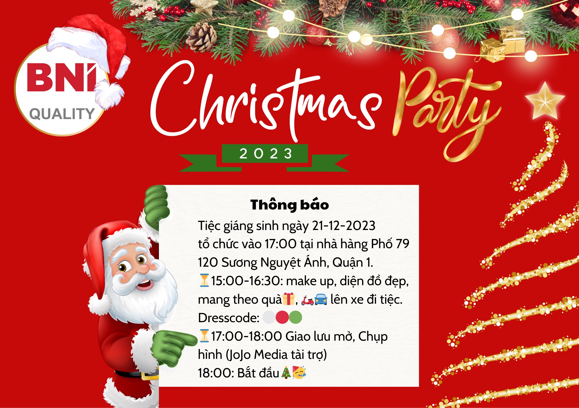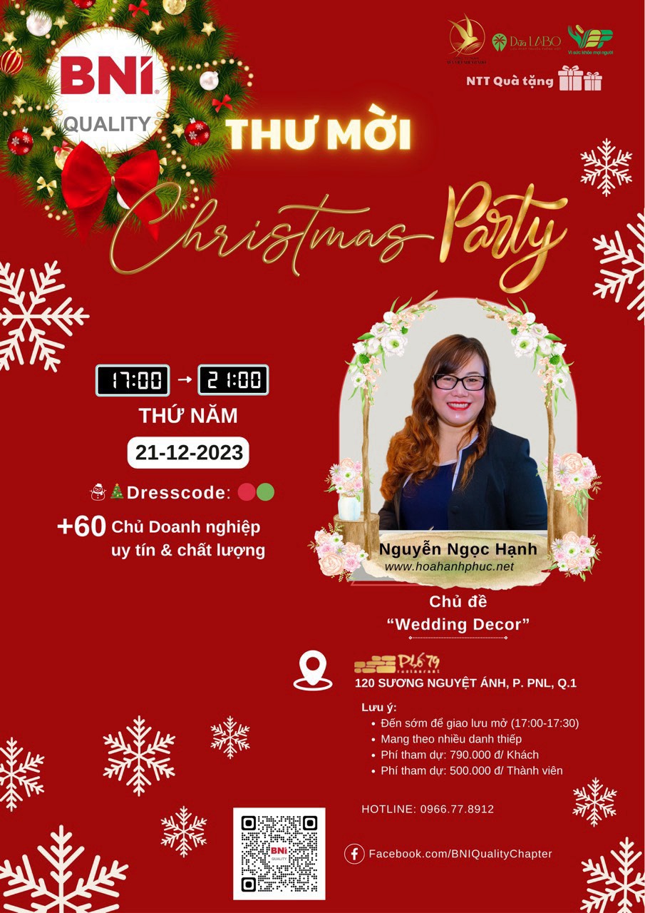 Ngày 21-12-2023, tại nhà hàng Phố 79, 120 Sương Nguyệt Ánh, Quận 1, thành phố Hồ Chí Minh. BNI Quality tổ chức một buổi tiệc giáng sinh đầy sôi động và ý nghĩa.