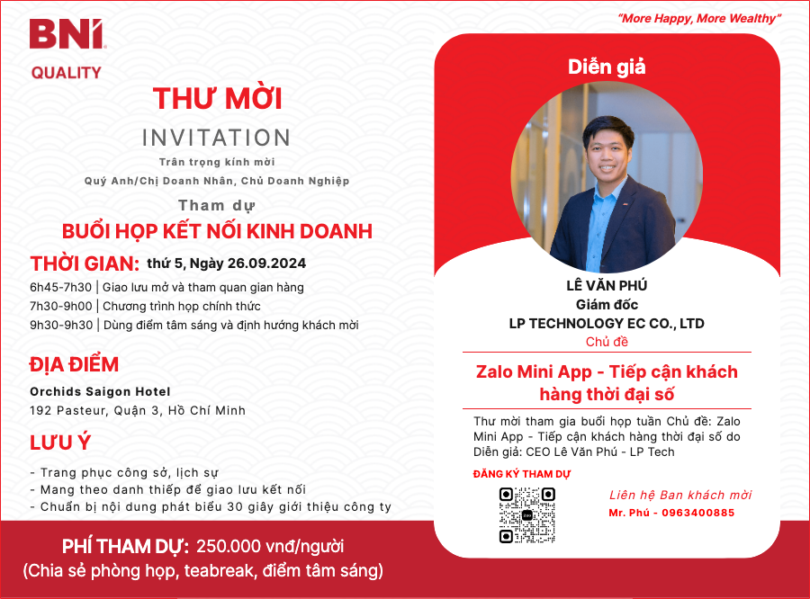 Sự kiện kết nối định kỳ hằng tuần, diễn giả Lê Văn Phú ,Ceo Founder Công ty LPTech chia sẻ về sản phẩm Zalo Mini App đến cộng đồng BNI hiểu rõ hơn về sản phầm và các lợi thế cho xu hướng mới hiện nay.